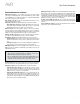 Troubleshooting AVR Symptom Unit does not function Troubleshooting Cause • No AC power Solution • Ensure that the power cord is plugged into a live AC power outlet • Check if the AC outlet is switch-controlled • Intermittent input connection • Secure all input and speaker connections • Mute is on • Press Mute button • Volume control is turned down • Turn up Volume control • Amplifier is in protection mode due to possible short circuit • Check all speaker wires at speaker and AVR conne