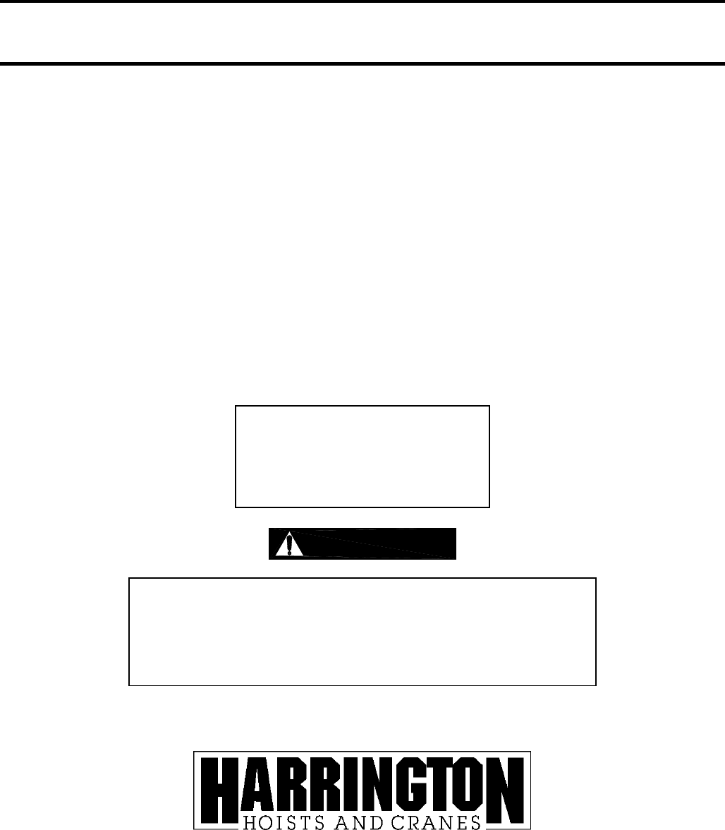 www.harringtonhoists.com Harrington Hoists, Inc. 401 West End Avenue Manheim, PA 17545-1703 Phone: 717-665-2000 Toll Free: 800-233-3010 Fax: 717-665-2861 Harrington Hoists – Western Division 2341 Pomona Rd.