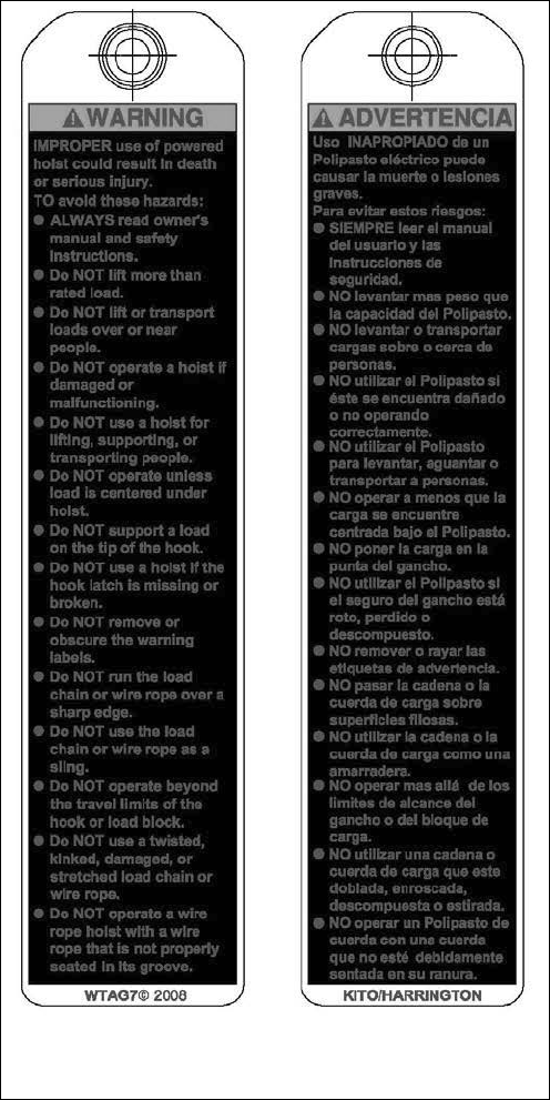 attached to the pendant cord for your hoist/trolley, order a tag from your dealer and install it. Read and obey all warnings
