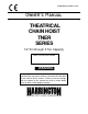 EFFECTIVE: November 1, 2013 THEATRICAL CHAIN HOIST TNER SERIES 1/2 Ton through 2 Ton Capacity Code, Lot and Serial Number This equipment should not be installed, operated, or maintained by any person who has not read and understood all the contents of this manual. Failure to read and comply with the contents of this manual can result in serious bodily injury or death, and/or property damage.