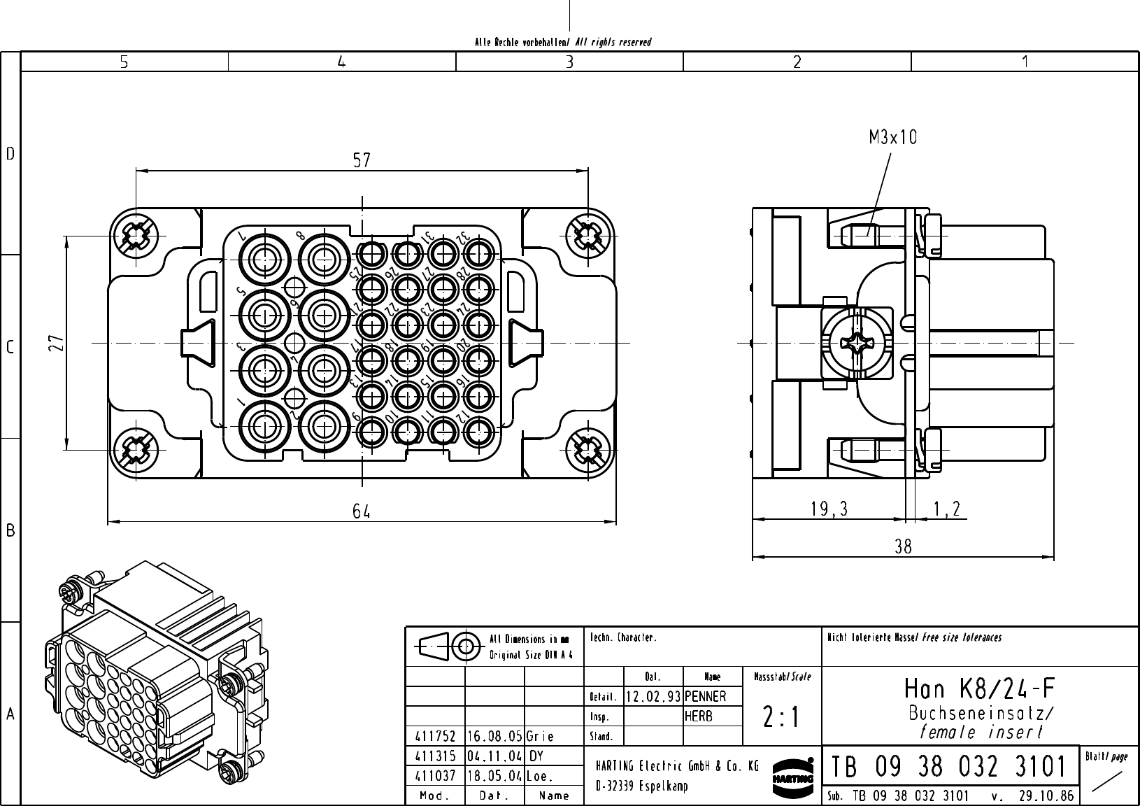 Female insert, HanK 8/25 32 Poles Socket, Crimp