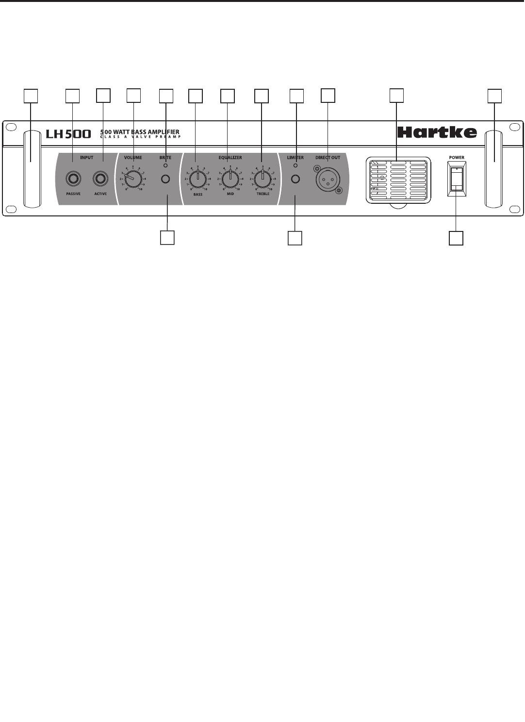 1. Handle – Two convenient metal handles make the amplifier easy to transport and easy to position while on