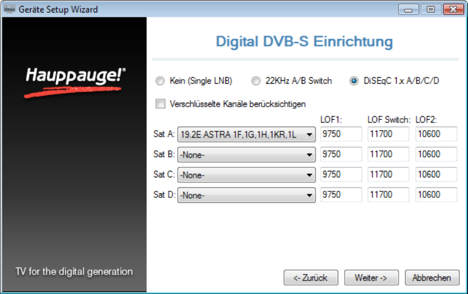 DiSEqC 1.x A/B/C/D : Wählen Sie diese Option, wenn maximal vier LNBs über einen