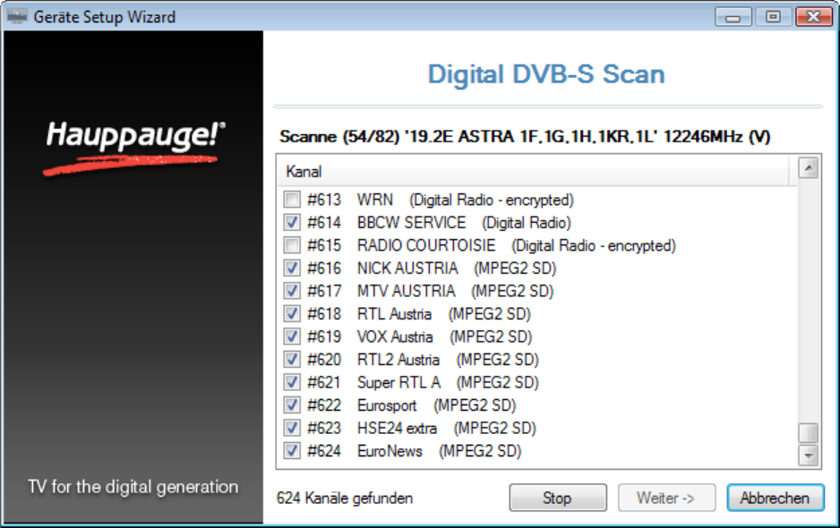 Klicken Sie auf „Weiter ->“, um den Sendersuchlauf zu starten. Die gescannten