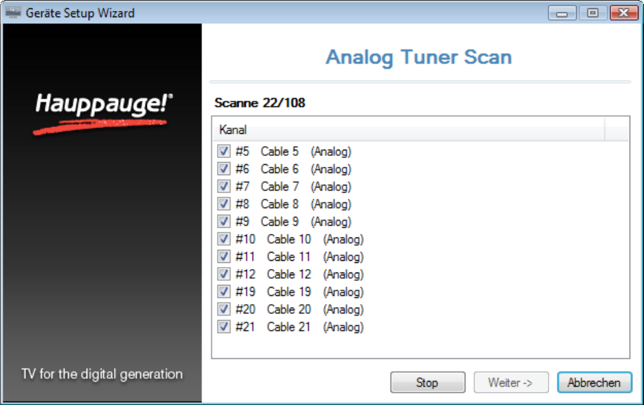 Gefundene Sender werden während des Suchlaufs aufgelistet.