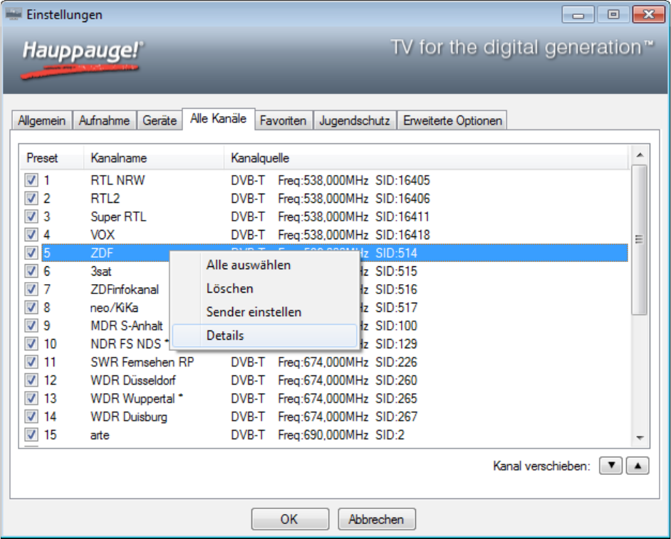 Auf der Registerkarte „Alle Kanäle“ werden alle in der Senderdatenbank vorhandenen Kanäle