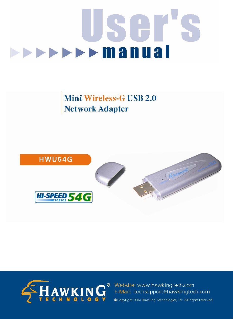 1 Introduction Thank you for purchasing the Hawking Hi-Speed 802.11g Wireless LAN Mini USB Adapter. This USB Adapter is designed to comply with the IEEE 802.11g Wireless LAN standard and is small enough to take with you in your pocket or keychain. The HWU54G is compatible with both laptops and desktops. This adapter supports 64/128/256-bit WEP data encryption that protects your wireless network from outside intruders.