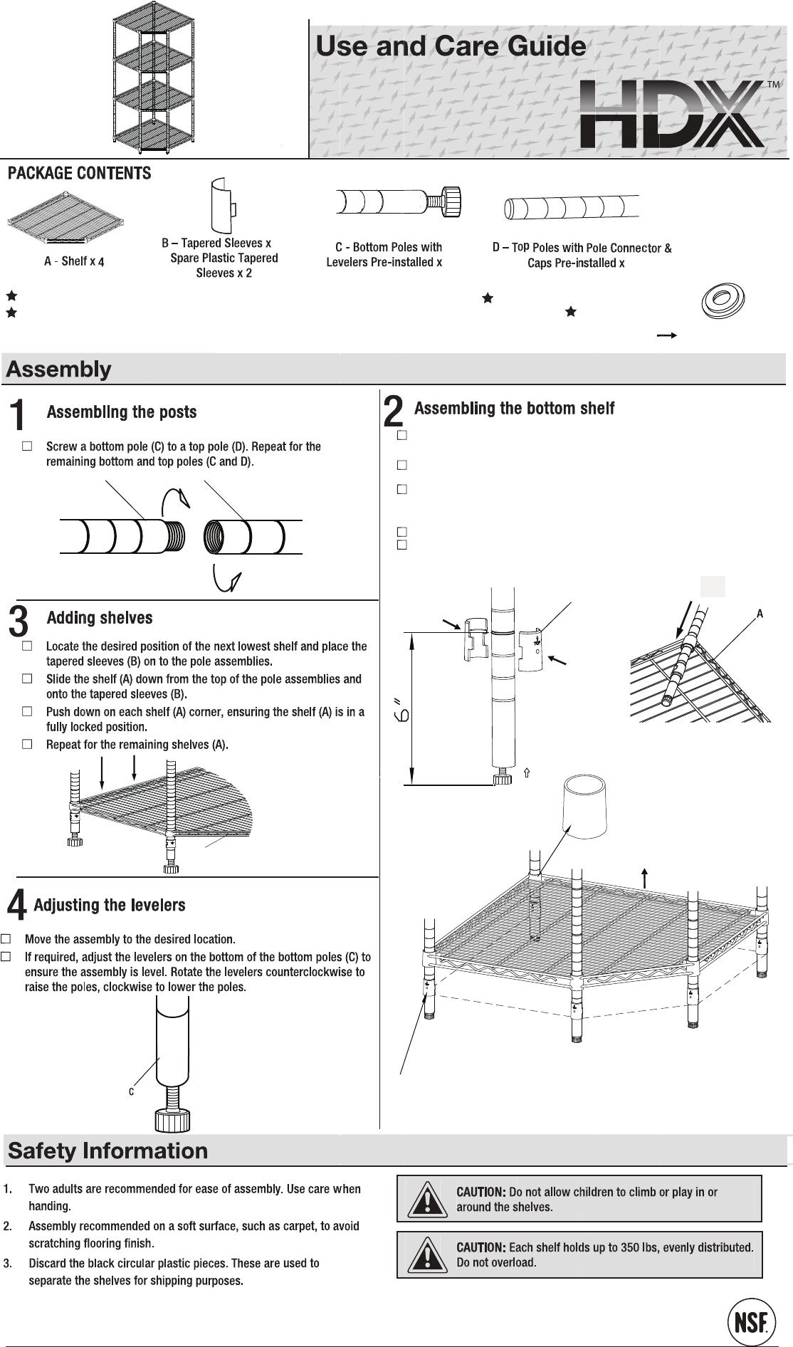 Place the shelf (A) on its side and slide each pole assembly with tapered locks