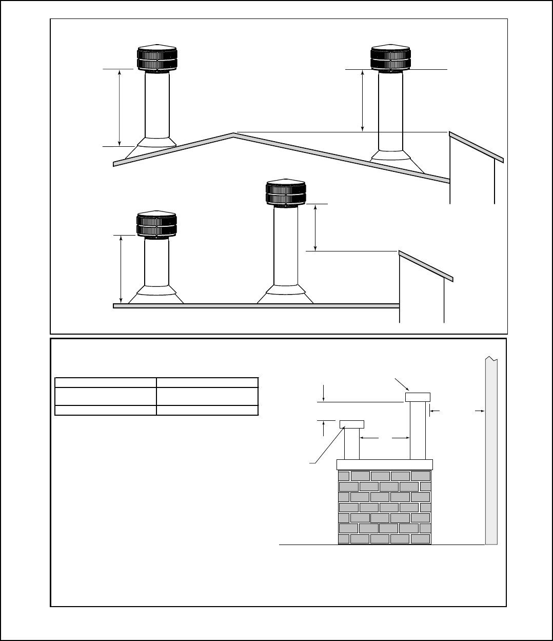 • The bottom of the termination cap must be at least 3 ft (.91 m) above the roof AND at least 2 ft (.61 m) above any portion