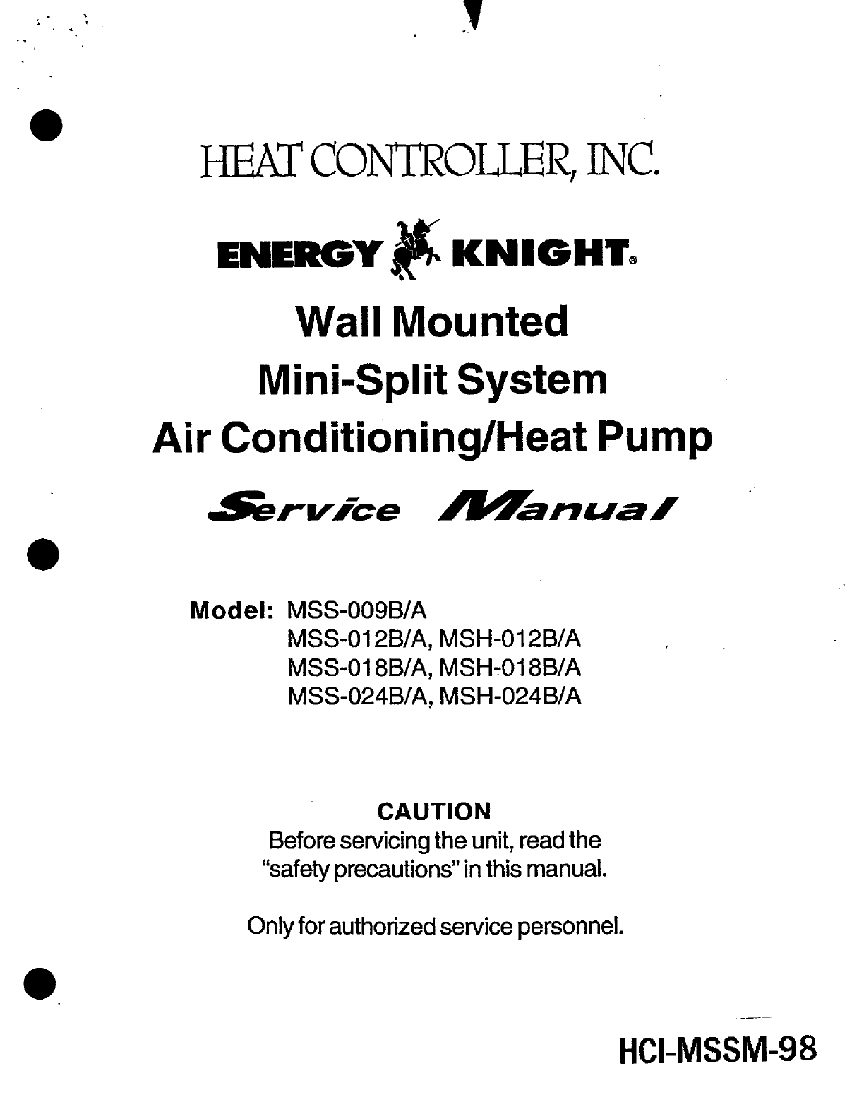 " HEAT CONTROLLER, INC. 'k Ae' ENERGY ,(Piý4 KNIGHT. Wall Mounted Mini-Split System Air Conditioning/Heat Pump .Siervice iýanua/ 0 Model: MSS-009B/A MSS-012B/A, MSH-01 2B/A MSS-018B/A, MSH-0186/A MSS-024B/A, MSH-024B/A CAUTION Before servicing the unit, read the "safety precautions" in this manual. Only for authorized service personnel.