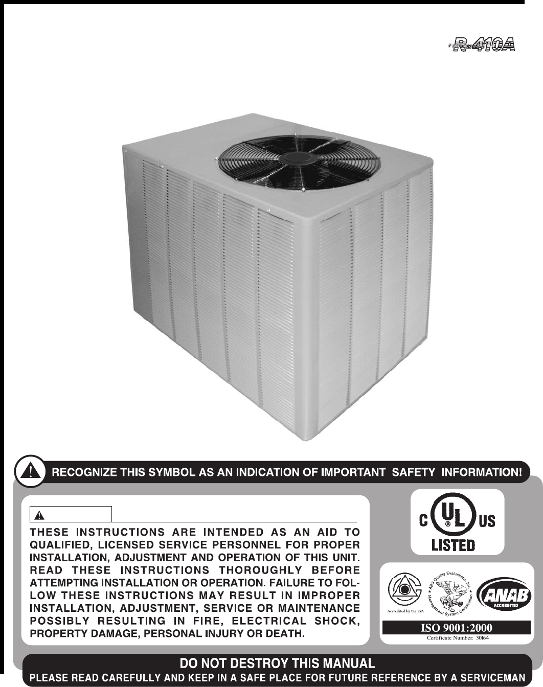 XVI. R-410A REFRIGERANT A. TOOLS REQUIRED FOR INSTALLING & SERVICING R-410A MODELS Manifold Sets: -Up to 800 PSIG High Side -Up to 250 PSIG Low Side -550 PSIG Low Side Retard Manifold Hoses: -Service Pressure Rating of 800 PSIG Recovery Cylinders: -400 PSIG Pressure Rating -Dept. of Transportation 4BA400 or 4BW400 ! CAUTION R-410A systems operate at higher pressures than R-22 systems. Do not use R-22 service equipment or components on R-410A equipment. B.