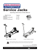 Service Jacks Operating Instructions & Parts Manual Model Number HW93657 HW93667 (Air/Manual) HW93660 HW93662 (Air/Manual) Model No. HW93657 & HW93660 ! Capacity 4 Ton 4 Ton 10 Ton 10 Ton Made in the U.S.A. Model No. HW93667 & HW93662 This is the safety alert symbol. It is used to alert you to potential personal injury hazards. Obey all safety messages that follow this symbol to avoid possible injury or death. SFA Companies 10939 N. Pomona Ave.