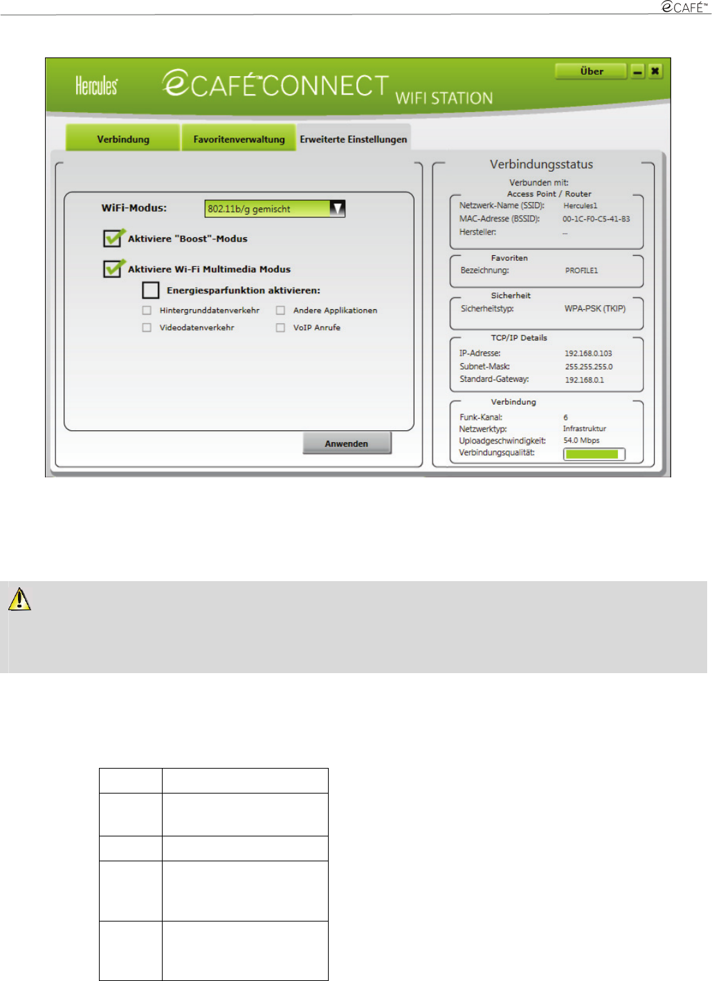 - Aktivieren WiFi Multimedia Modus: Dieser Modus läßt Sie Prioritäten bezüglich der Datentypen im Netzwerk festlegen.