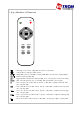 2. R F S PE C of R emote Controller - Tr ansmi ssi on Fr equency : 433. 92MHz Out put power : 4dBm under Dat a r at e : 2400bps Bi nar y FSK Fr equency Devi at i on: 64KHz under Har moni cs : - 20dBc over Occupi ed Bandwi dt h : 1.