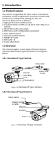 1 Introduction 1.1 Product Features The camera is applicable for both indoor and outdoor conditions, and the application scenarios include road, warehouse, underground parking lot, bar, etc.. The main features are as follows: High performance CMOS sensor Low illumination, 0.005 Lux @ (F2.0, AGC ON), 0 Lux with IR IR cut filter with auto switch OSD menu with configurable parameters Auto white balance internal synchronization SMART IR mode PoC (with -E) 3-axis adjustment 1.