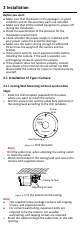 2 Installation Before you start: Make sure that the device in the package is in good condition and all the assembly parts are included. Make sure that all the related equipment is power-off during the installation. Check the specification of the products for the installation environment. Check whether the power supply is matched with your power output to avoid the damage. Make sure the wall is strong enough to withstand three times the weight of the camera and the bracket.