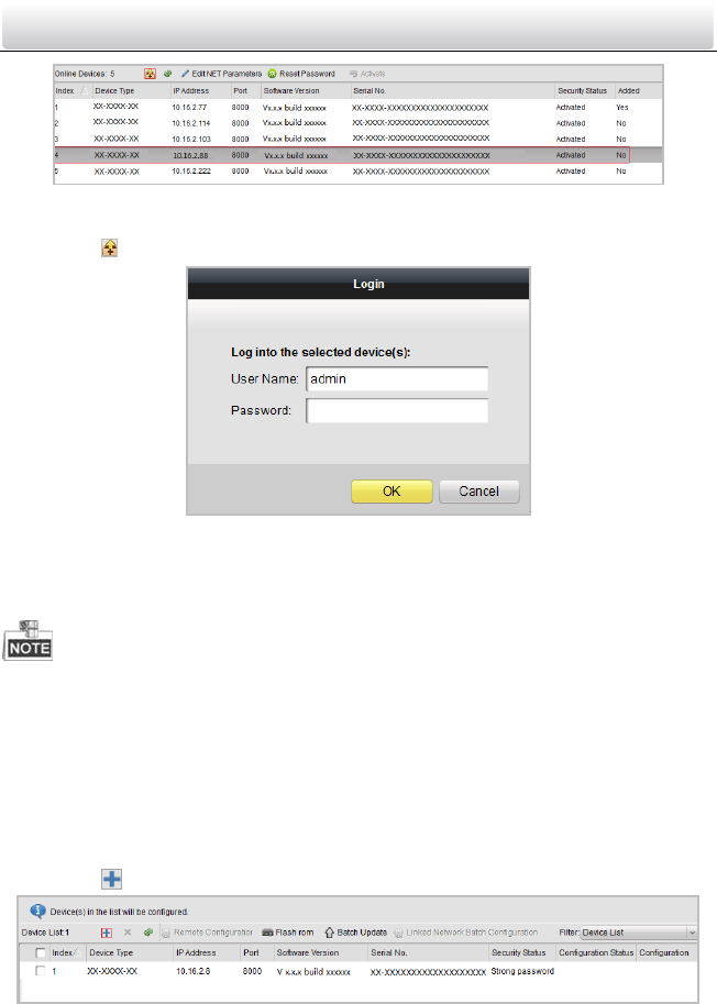 3. Enter the IP address, and set the port No., user name and password of the device.