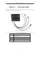 DS-MP1301 LCD Mobile Monitor Chapter 3 Connecting Cables DS-MP1301 LCD Mobile Monitor can be connected to the mobile DVR, rear-view camera and the other camera. Refer to Figure 3.1 and Table 3.1 for the cable connections. Figure 3. 1 Cable Connections Table 3. 1 Cable Connections Description No. Description For connecting to the AV OUT interface of the mobile DVR which is 1 used to power the monitor. 2 For connecting to the rear-view camera. 3 For connecting to the other camera.