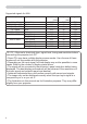 RS-232C Communication / Network command table (continued) Names Operation Type SEARCH SKIP COMPUTER IN1 Set SEARCH SKIP COMPUTER IN2 Set SEARCH SKIP LAN Set SEARCH SKIP USB TYPE A Set SEARCH SKIP HDMI 1 Set SEARCH SKIP HDMI 2 / MHL Set SEARCH SKIP VIDEO Set AUTO SEARCH DIRECT POWER ON Set Set AUTO POWER ON VIDEO Set AUTO POWER ON HDMI 2 / MHL Set AUTO POWER ON COMPUTER IN 1 Set AUTO POWER OFF LAMP TIME LOW LAMP TIME HIGH LAMP TIME Reset FILTER TIME LOW FILTER TIME HIGH FILTER TIME