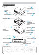 Namen onderdelen Namen onderdelen Projector Focus ring ( 20) Luidspreker 17, 46) Lenskapje ( 20) Afstandsbedieningssensor ( 8) Ventilator ( 10) Lens ( Zoom ring ( 12) Elevator-knop ( 6, 17) 12) Afstelvoetje ( Voorkant rechts Lampdeksel ( 43) (Lamp eenheid zit binnen.) $IGHNNDS OXFKW¿OWHU ( 9, 10, 44) /XFKW¿OWHU HQ inlaat-ventilator zitten binnen.) Onderkant Bedieningsknoppen ( 5) AC-ingang ( Poorten (Zie hieronder.