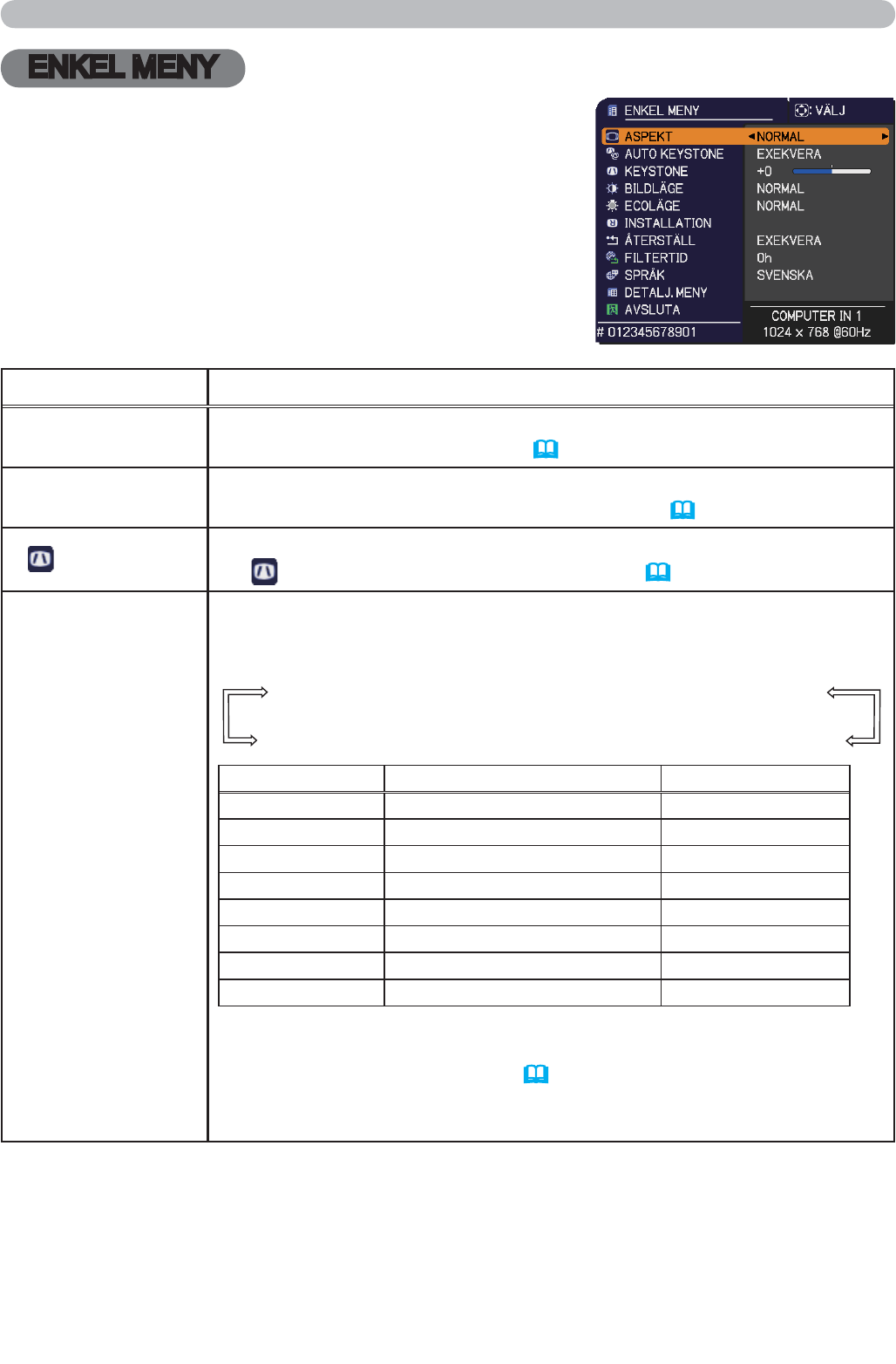 Med ◄/►-knapparna korrigeras den vertikala keystone-störningen.