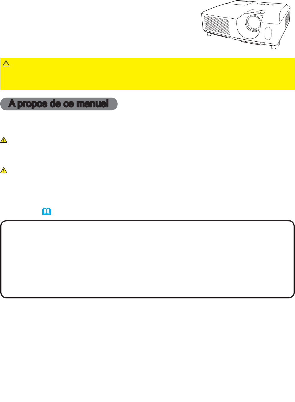 Projecteur CP-X2015WN/CP-X2515WN/CP-X3015WN/ CP-X4015WN/CP-WX2515WN/CP-WX3015WN Manuel d'utilisation (détaillé) Guide d'utilisation Merci d'avoir acheté ce projecteur. AVERTISSEMENT ►Avant d'utiliser ce produit, veuillez lire tous les manuels le concernant. Assurez-vous de lire le Guide de sécurité en premier. Après les avoir lus, rangez-les dans un endroit sûr pour pouvoir vous y reporter par la suite. A propos de ce manuel Divers symboles sont utilisés dans ce manuel.