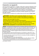 Entretien Remplacer la lampe (suite) Alerte lampe HAUTE TENSION HAUTE TEMPERATURE HAUTE PRESSION AVERTISSEMENT ►Le projecteur utilise une lampe en verre au mercure à haute pression. Si vous secouez ou que vous éraflez la lampe ou que vous la touchez lorsqu’elle est chaude ou trop usée, elle risque de se briser en explosant bruyamment ou de griller. Il faut noter que chaque lampe a une durée de vie différente et qu’il arrive que certaines lampes explosent ou grillent dès que vous les utilisez.