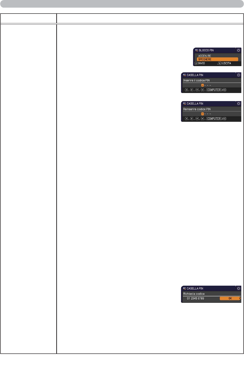 del dialogo CASELLA PIN, il proiettore si spegnerà.