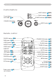 Part names Control buttons LAMP indicator (60, 61) TEMP indicator (60, 61) Cursor buttons ▲,▼,◄,► (24) POWER indicator (17, 60, 61) STANDBY/ON button (17) INPUT button (18) Remote control SEARCH button (19) STANDBY/ON button (17) RGB button (18) VIDEO RGB AUTO button (20) SEARCH VIDEO button (19) AUTO BLANK HOME PAGE UP VOLUME END PAGE DOWN MUTE ASPECT ASPECT button (19) HOME button (23) MAGNIFY ON button (21) OFF button (21) MAGNIFY ON MUTE button (18) FREEZE MY BUT