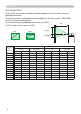 Setting up Arrangement Refer to the illustrations and tables below to determine the screen size and projection distance. The values shown in the table are calculated for a full size screen: 1024×768 (a) The screen size (diagonal) (b) Distance from the projector to the screen (±10%) (b) (c) The height of the screen (±10%) 4:3 (a) (c) up 16:9 (a) (c) down (a) Screen size [inch (m)] 4 : 3 screen (b) Projection distance (c) Screen height [m (inch)] [cm (inch)] min. up max.