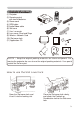 Contents of package Contents of package VIDEO RGB ASPECT MAGNIFY (1) Projector (2) Remote control with two AA batteries (3) Power cord (4) RGB cable (5) Audio/Video cable (6) Soft case (7) User’s manuals (8) Lens cover, Rivet and Strap (9) Wireless Network Card (10) Slot cover lock (11) Application CD ON OFF FREEZE SEARCH BLANK AUTO HOME PAGE UP END PAGE DOWN MY BUTTON 1 VOLUME MUTE KEYSTONE 2 MENU POSITION ENTER RESET ESC (1) (2) (4) (6) (9) (3) (5) (7) (10) (8) (11) NOT
