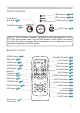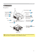 Part names Part names Projector ê Control buttons (7) Lamp cover (58) (Lamp unit is inside.) Remote sensor (18) Speaker Zoom ring (21) Security bar (11) (Use for attaching a commercial anti-theft chain or wire.) Focus ring (21) Vent Elevator button (10) Lens (19) Front-Right side Elevator foot (10) Lens cover (4) Filter cover (59) (Air filter and intake vent are inside.) ê EN E OS CL OP B US L RO NT T CO VID EO S-VID EO CR /PR CB /PB N LA DC I/O 5V 0.