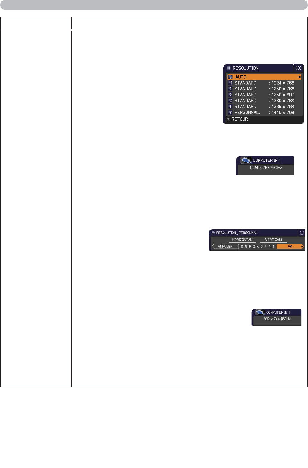 (1) Dans le Menu ENTR., choisir RESOLUTION avec les touches