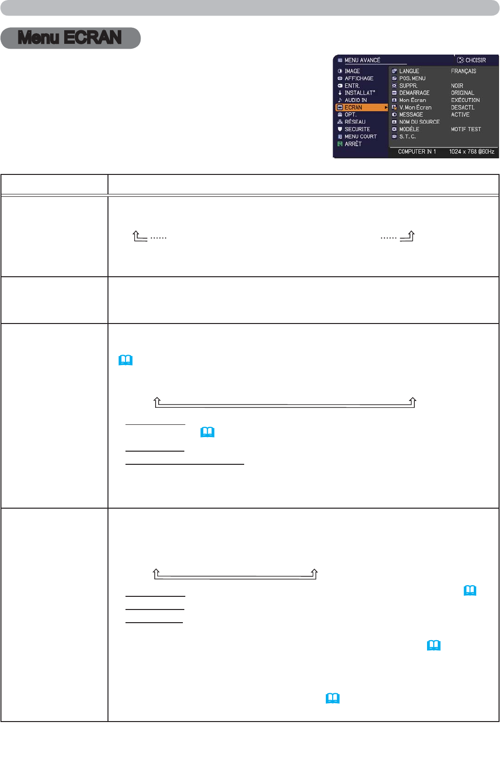 A partir du Menu ECRAN, vous pouvez accéder aux