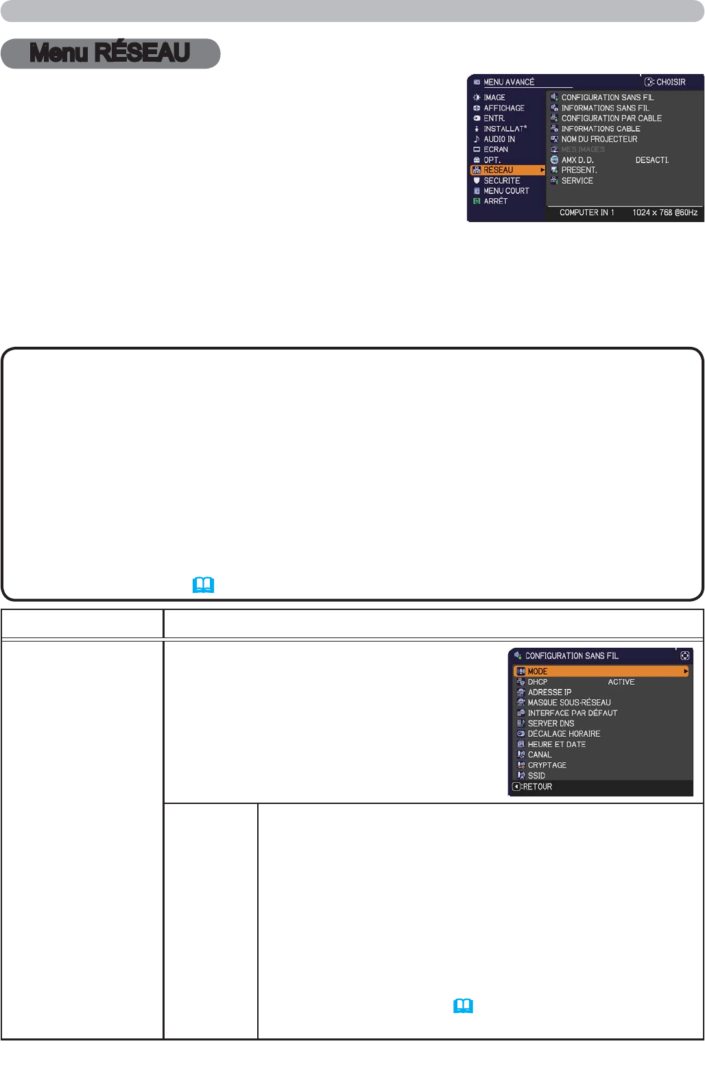 connexion entre le projecteur et le réseau après avoir réglé la rubrique MODE