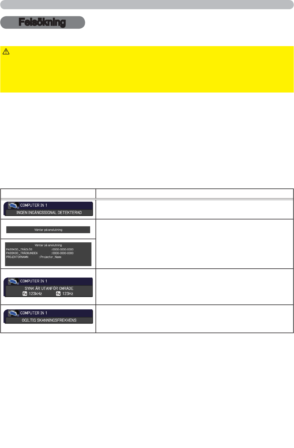 Om något problem inträffar med projektorn, rekommenderas att genomgå följande