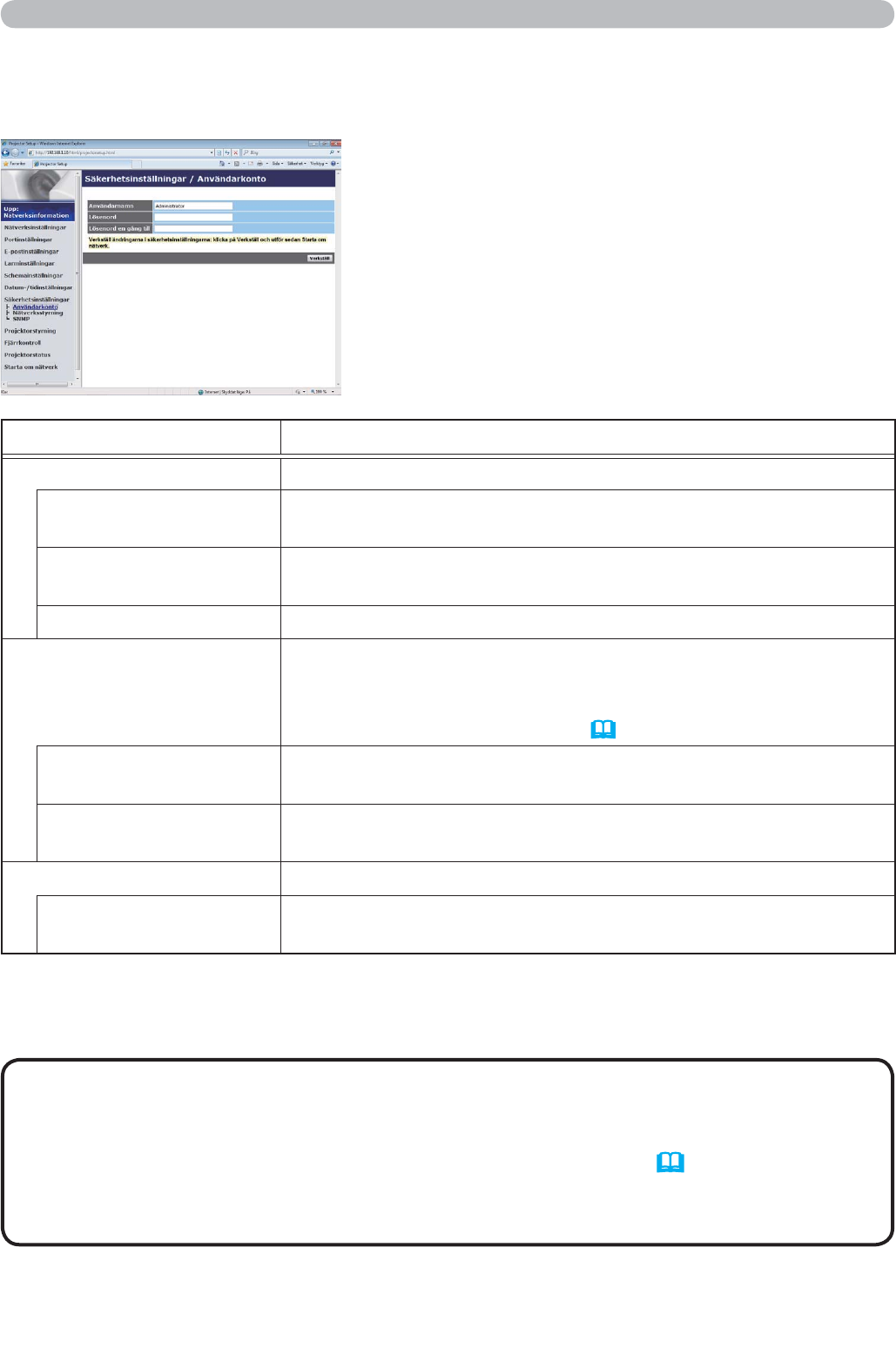 Användarkonto Konfigurerar användarnamnet och lösenordet.
