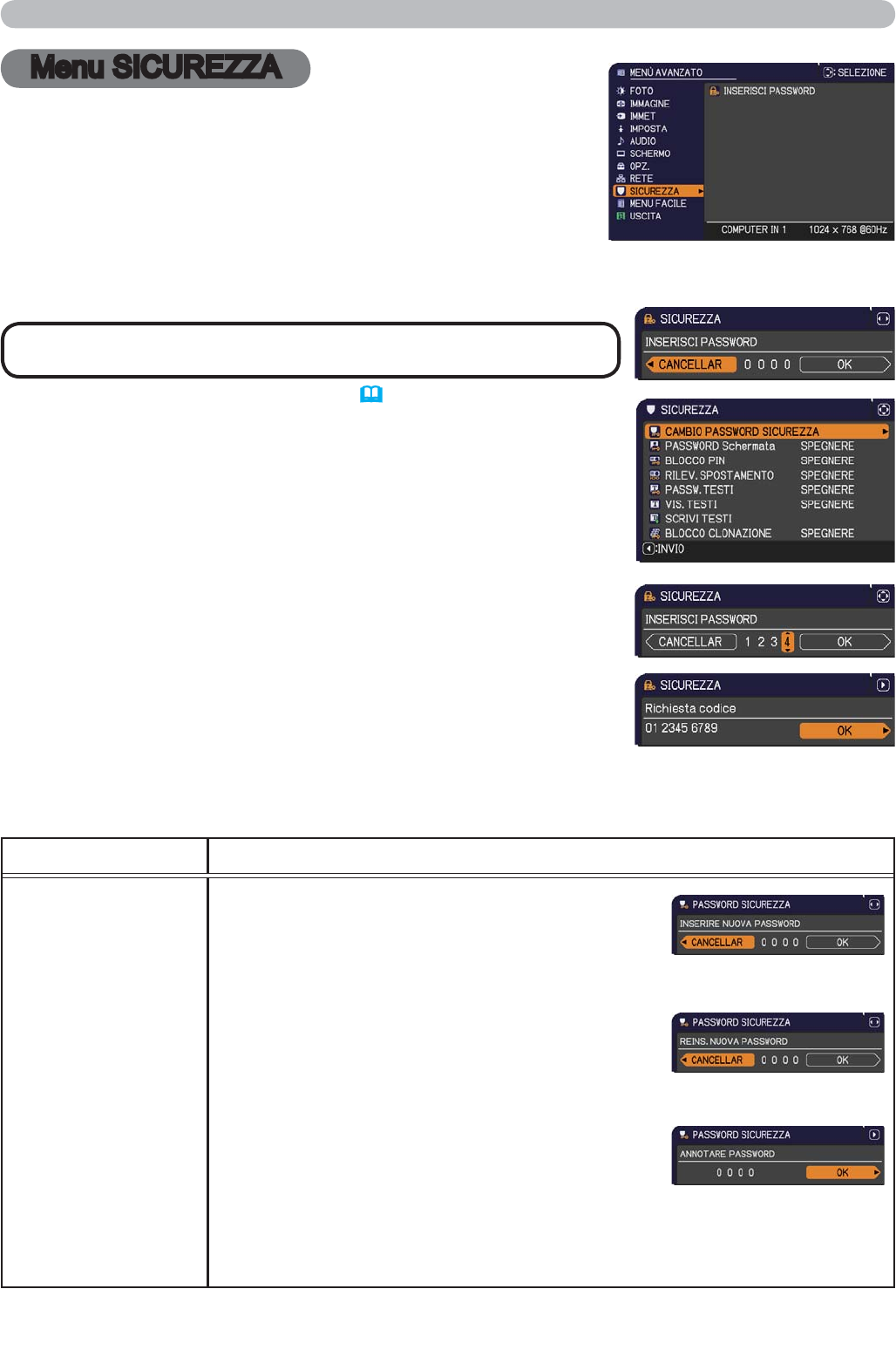 Utilizzo del menu SICUREZZA: Per l’utilizzo di tali funzioni è