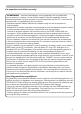 Veiligheidsmaatregelen (vervolg) OPMERKINGEN Over hulponderdelen. De lamp, LCD panelen, polarisatoren en andere optische componenten, en het luchtfilter en de koelventilatoren hebben elk een andere levensduur. Deze onderdelen zouden kunnen moeten worden vervangen na een lange gebruiksduur. • Dit product is niet ontworpen voor langdurig continu gebruik.