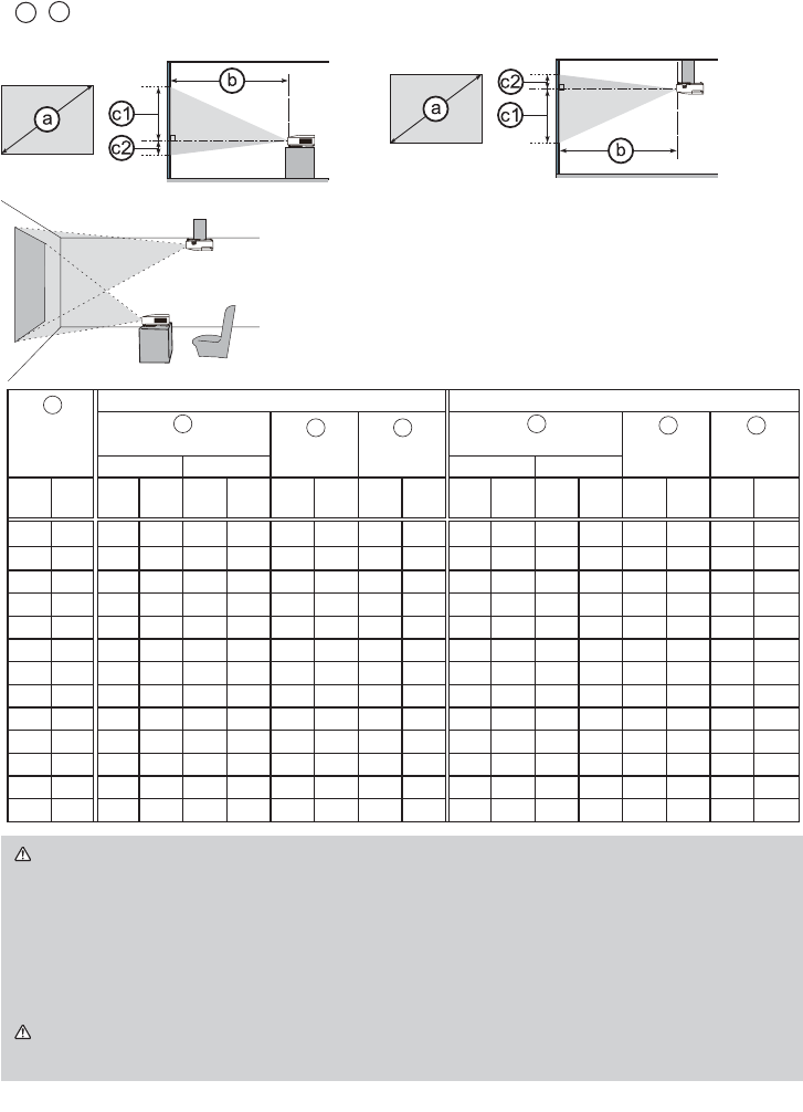 Se illustrasjonene og tabellene nedenfor for å avgjøre skjermstørrelsen og prosjektoravstanden.