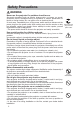 Safety Precautions (continued) NOTE About consumables. Lamp, LCD panels, polarizors and other optical components, and air filter and cooling fans have a different lifetime in each. These parts may need to be replaced after a long usage time. • This product isn’t designed for continuous use of long time.