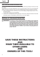 English SAFETY GENERAL SAFETY RULES – FOR ALL BATTERY OPERATED TOOLS WARNING: Read and understand all instructions. Failure to follow all instructions listed below, may result in electric shock, fire and/or serious personal injury. SAVE THESE INSTRUCTIONS 1. 2. 3. 4 Work Area (1) Keep your work area clean and well lit. Cluttered benches and dark areas invite accidents. (2) Do not operate power tools in explosive atmospheres, such as in the presence of flammable liquids, gases, or dust.