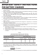 English 10. Do not operate battery charger if it has received a sharp blow, been dropped, or otherwise damaged in any way; take it to a qualified serviceman. 11. Do not disassemble battery charger; take it to a qualified serviceman when service or repair is required. Incorrect reassembly may result in a risk of electric shock or fire. 12. To reduce risk of electric shock, unplug charger from receptacle before attempting any maintenance or cleaning. Removing the battery will not reduce this risk.