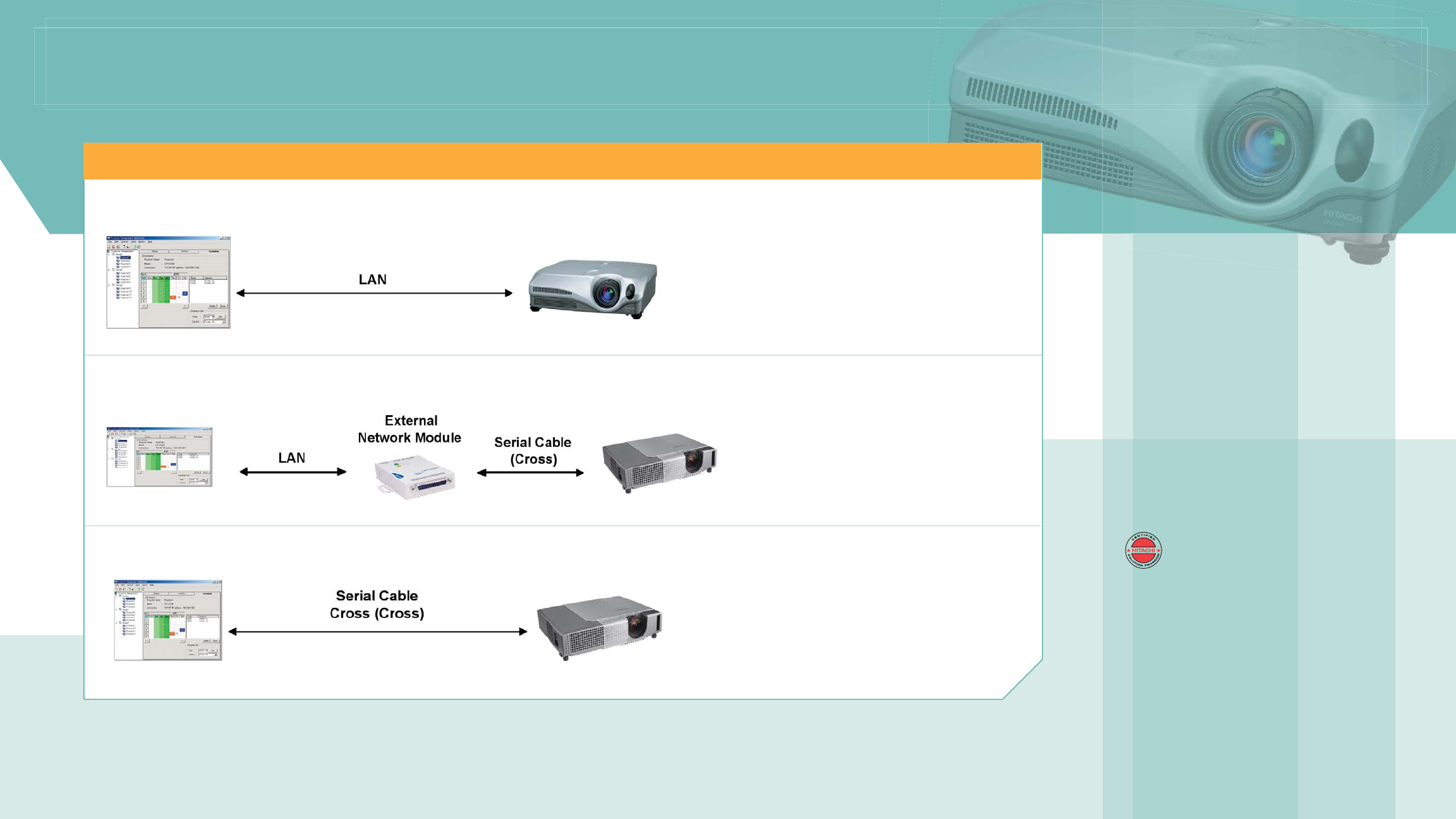 Connect PJ Man to Hitachi Projectors using an external Networking Module* (Ethernet to Serial).
