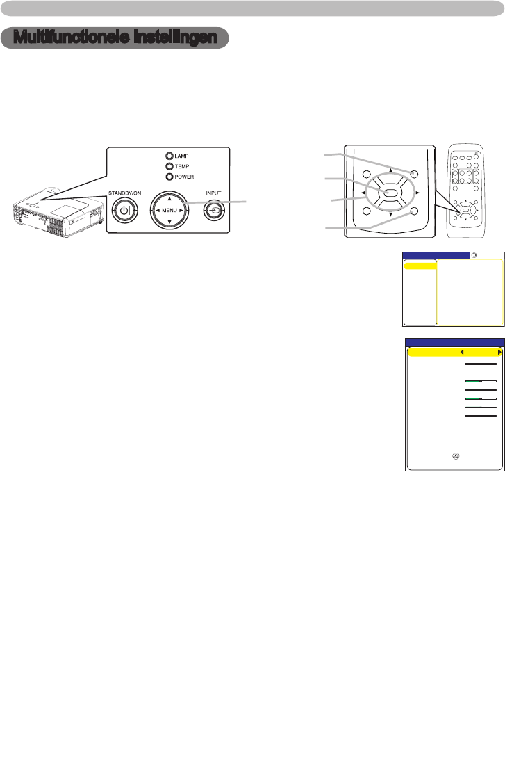 Deze projector heeft de volgende menus: FOTO, BEELD, INPUT, INSTELLING, SCHERM,