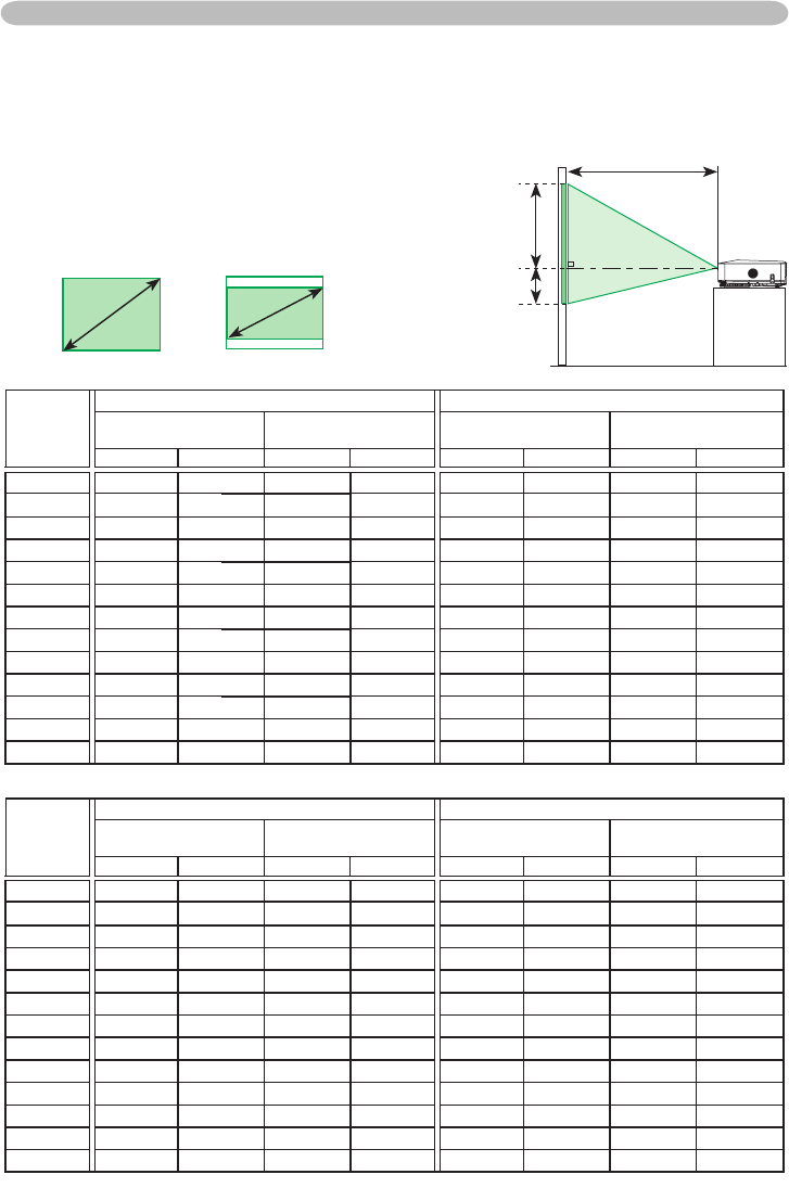 Bekijk de hier beneden staande illustraties en tabellen, om de beeldgrootte en de projectie-afstand te bepalen.