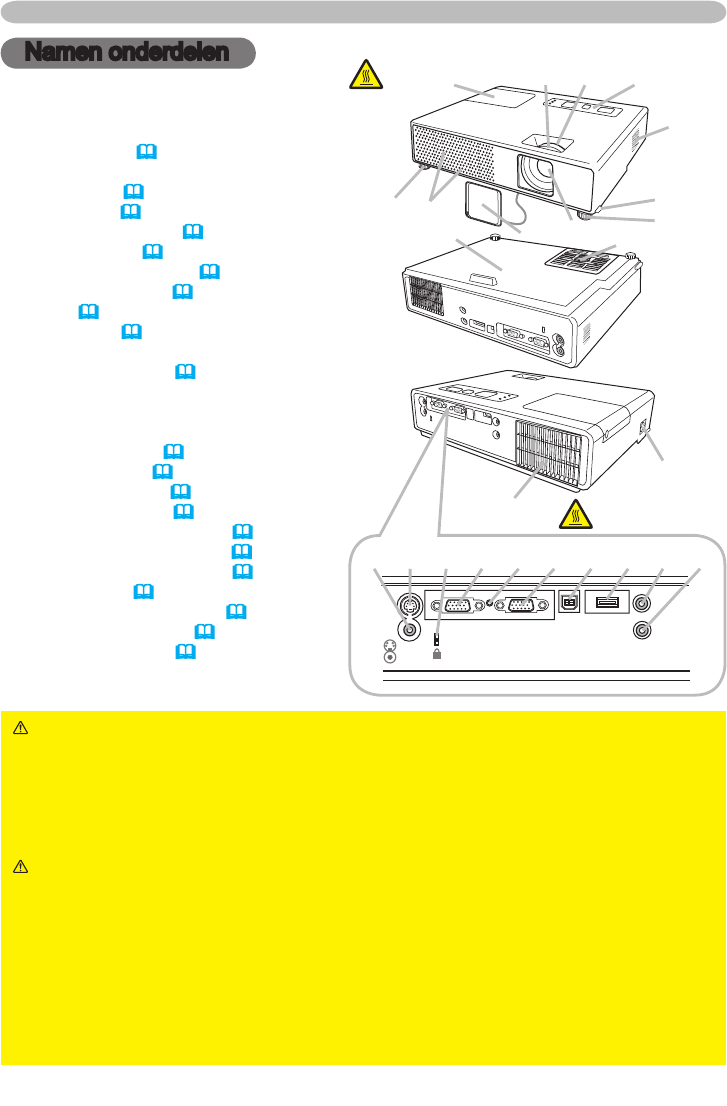 ► Kijk niet in de lens of ventilatoren terwijl de lamp aan is, omdat het sterke