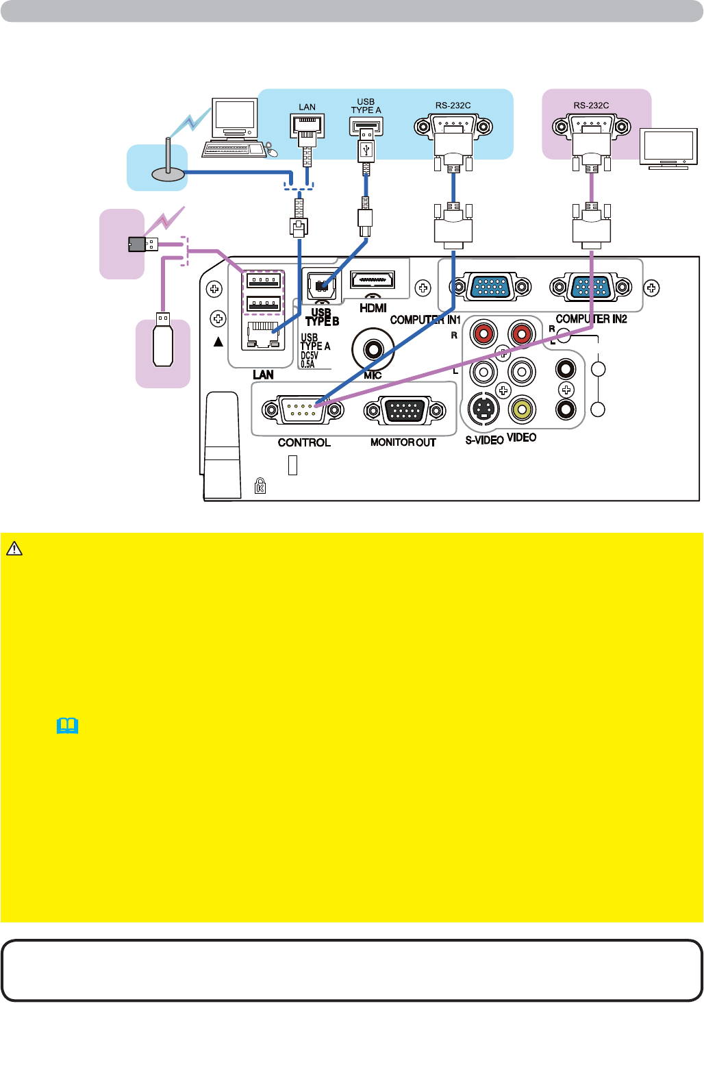 ►To connect both the LAN cable and USB device to the projector, use a LAN