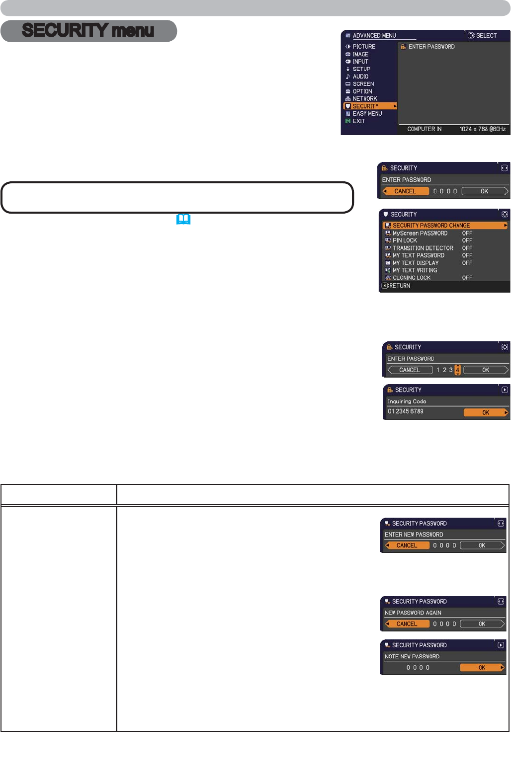 (1) Use the ▲/▼ buttons on the SECURITY menu