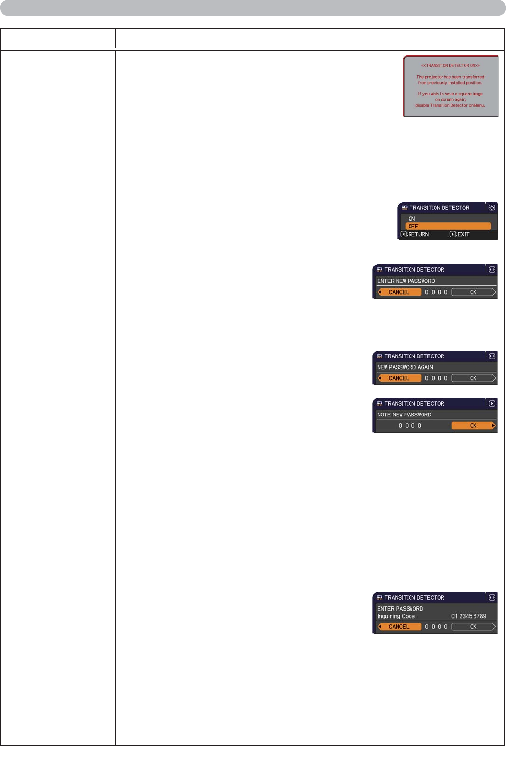 projector will return to the TRANSITION DETECTOR on/off menu.